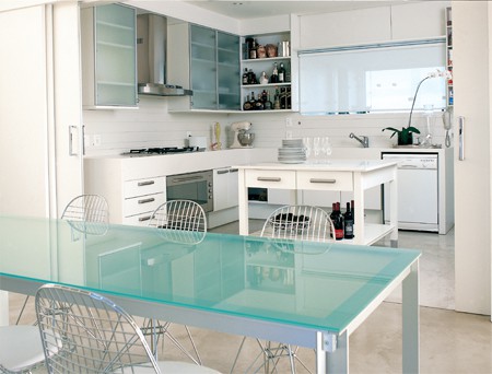 Quando é preciso, uma porta de correr isola a cozinha da sala de jantar. O cimento queimado ocupa cada centímetro do piso deste apartamento, sem excessos nem toques de cor, assim,sala de estar,sala de jantar e cozinha ficam totalmente integrados.